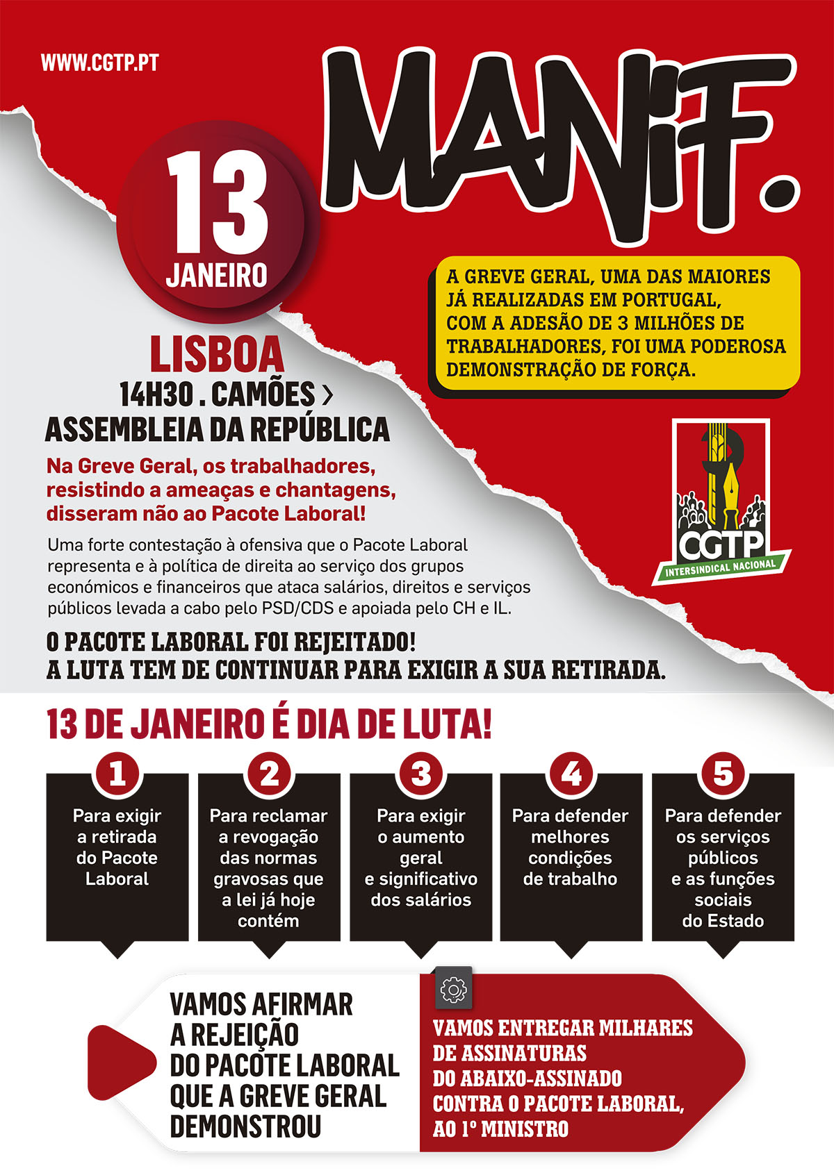 Depois da grande Greve Geral do passado dia 11 de Dezembro, onde os trabalhadores se fizeram ouvir e afirmaram bem alto a sua rejeição ao pacote laboral e a exigência da sua retirada, a CGTP-IN decidiu marcar para o próximo dia 13 de Janeiro de 2026 uma Manifestação, com início pelas 14h30 no Camões seguindo para S. Bento.