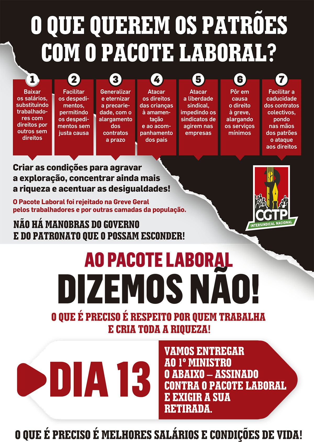 7. O esclarecimento e mobilização dos trabalhadores para a luta vão continuar, desde já, com a continuação e intensificação da recolha de assinaturas de rejeição deste Pacote Laboral e de exigência do aumento dos salários de todos os trabalhadores.